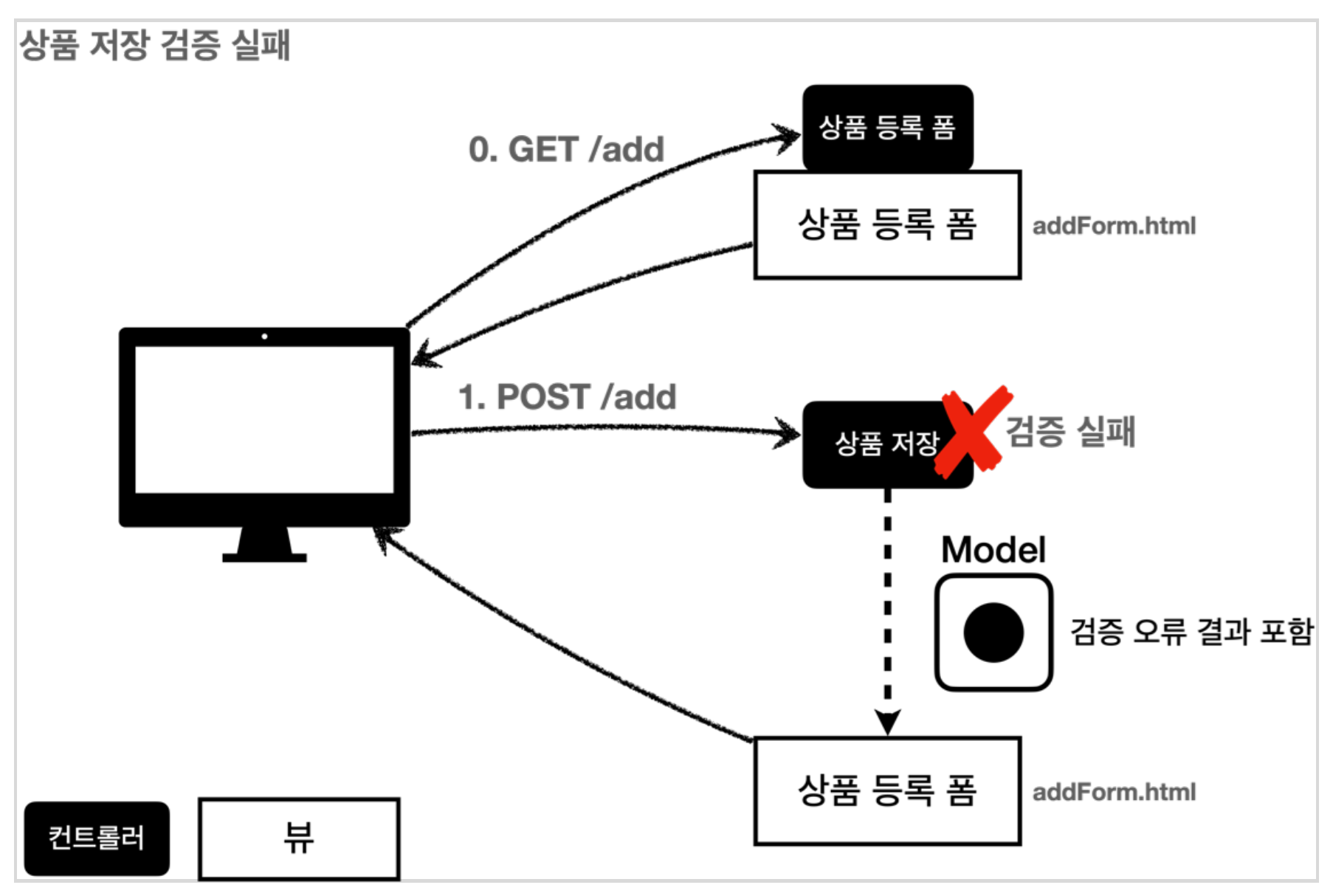 서버에서 검증을 한 결과 사용자의 입력 정보에 문제가 있는 것이 확인된 경우, 사용자가 입력한 정보(컨트롤러에 넘긴 정보)를 그대로 유지한 채로 입력 화면으로 돌아가 어느 부분에서 검증 오류가 발생했는지 보여줘야 한다.